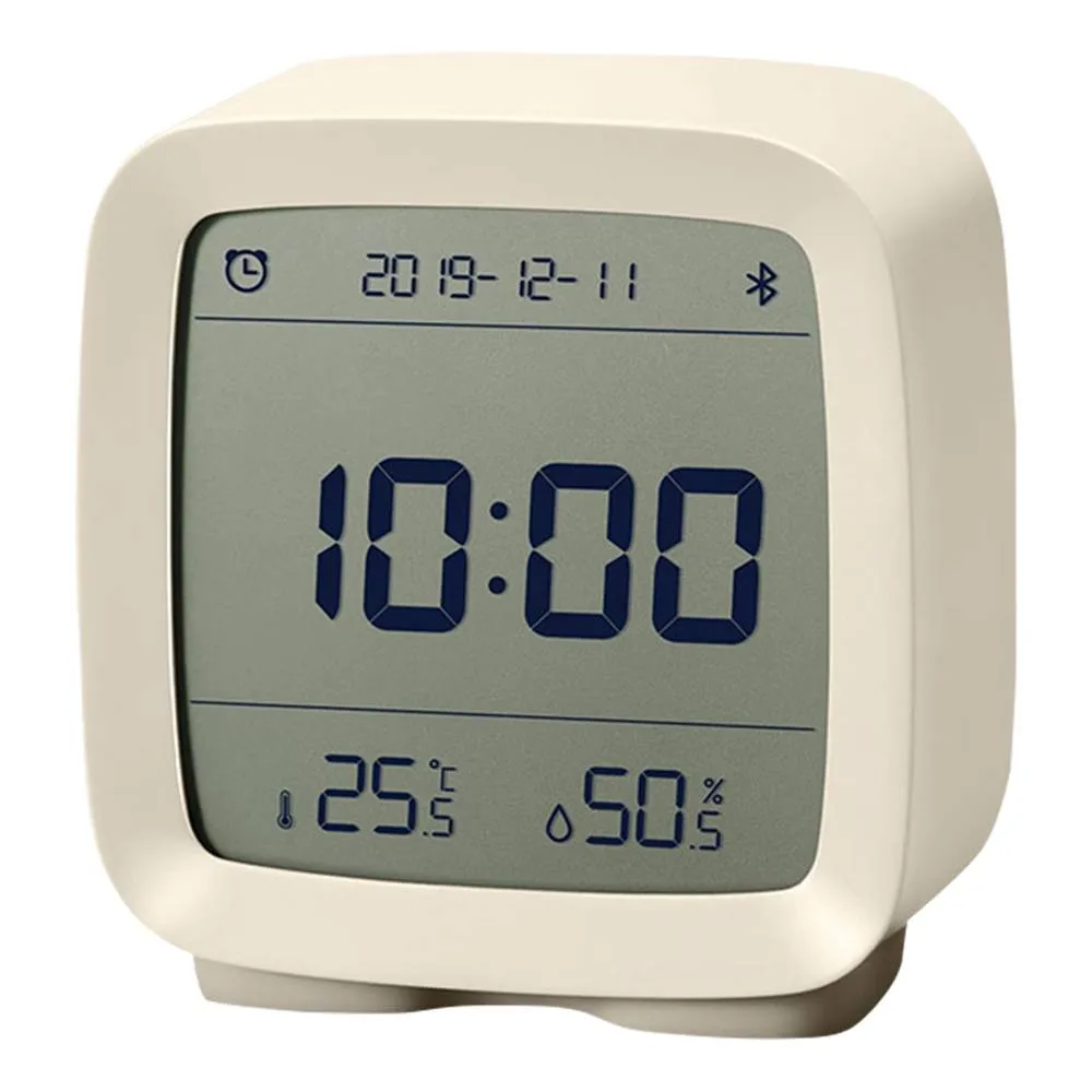 Cleargrass (Qingping) alarm clock, segment LCD, encrypted, broadcasts temperature, humidity and battery status. Requires a bindkey in order to decrypt the received data (see Obtaining the Bindkey).